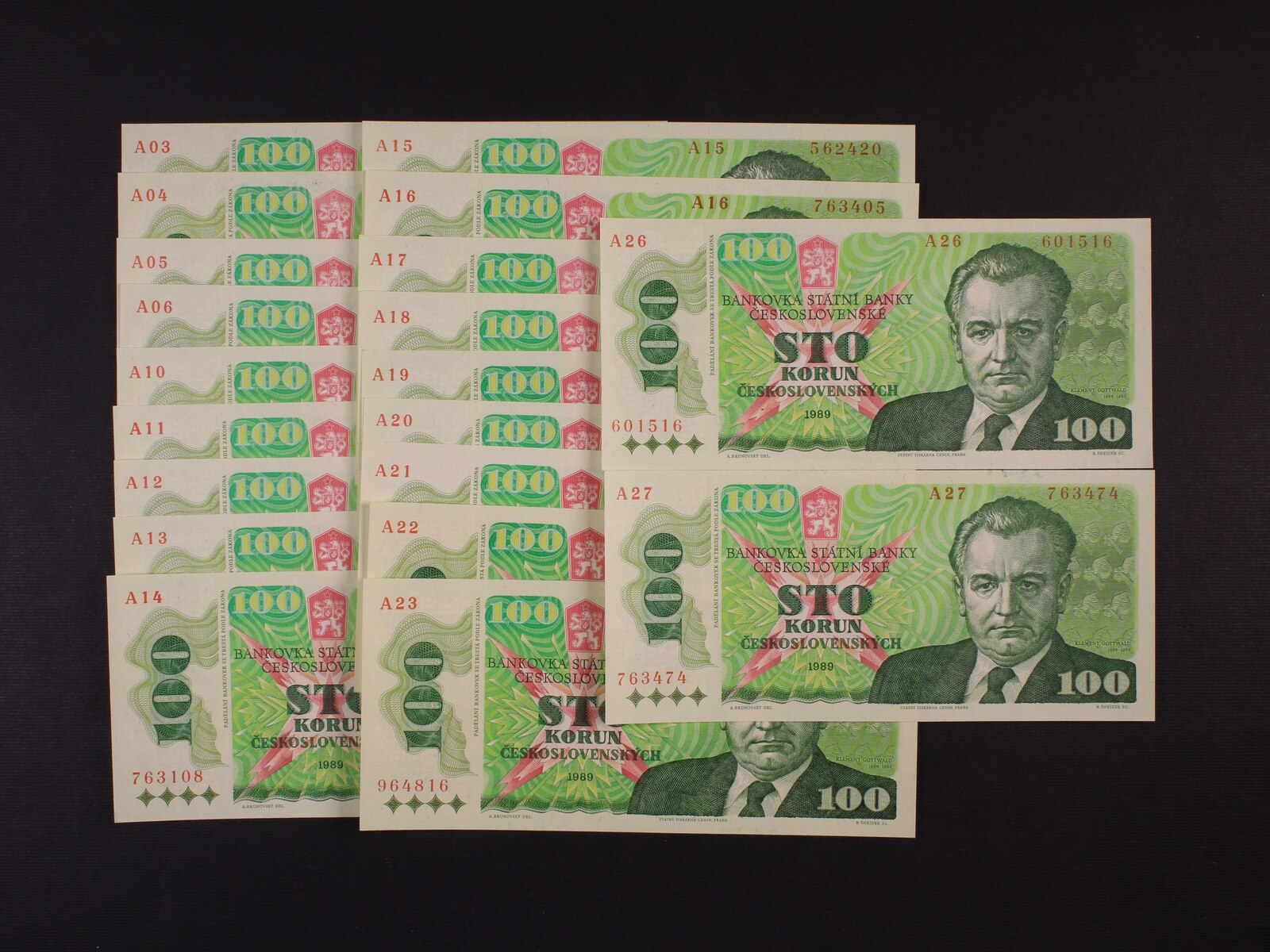 100 Kčs 1989 série A 03, 04, 05, 06, 10, 11, 12, 13, 14, 15, 16, 17, 18, 19, 20, 21, 22, 23, 26, 27, Ba. 106, Pi. 97, 20 kusů