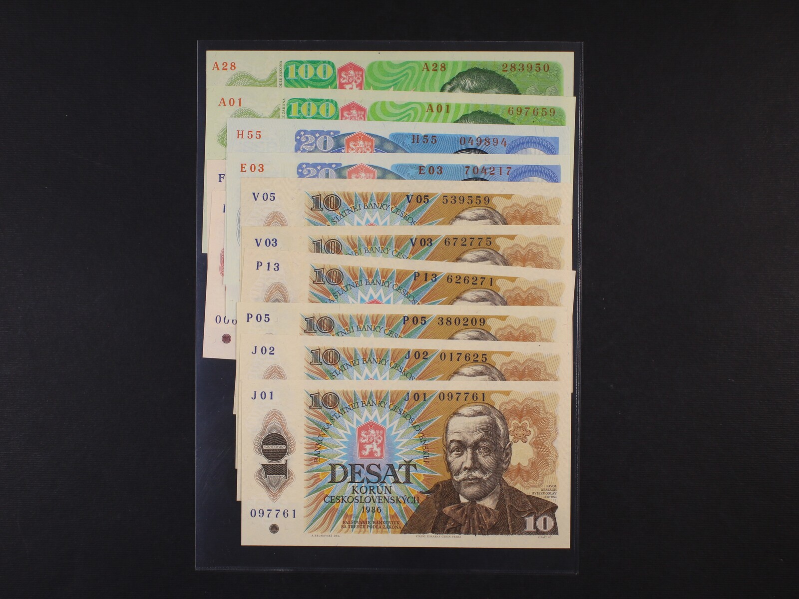sada bankovek 10 Kčs 1986 série V 03, V 05, P 05, J 01, J 02, 20 Kčs 1988 série E 03, H 55, 50 Kčs 1987 série F 61, I 08, 100 Kčs 1989 série A01, A 28, Ba. 103 - 106, celkem 12 kusů