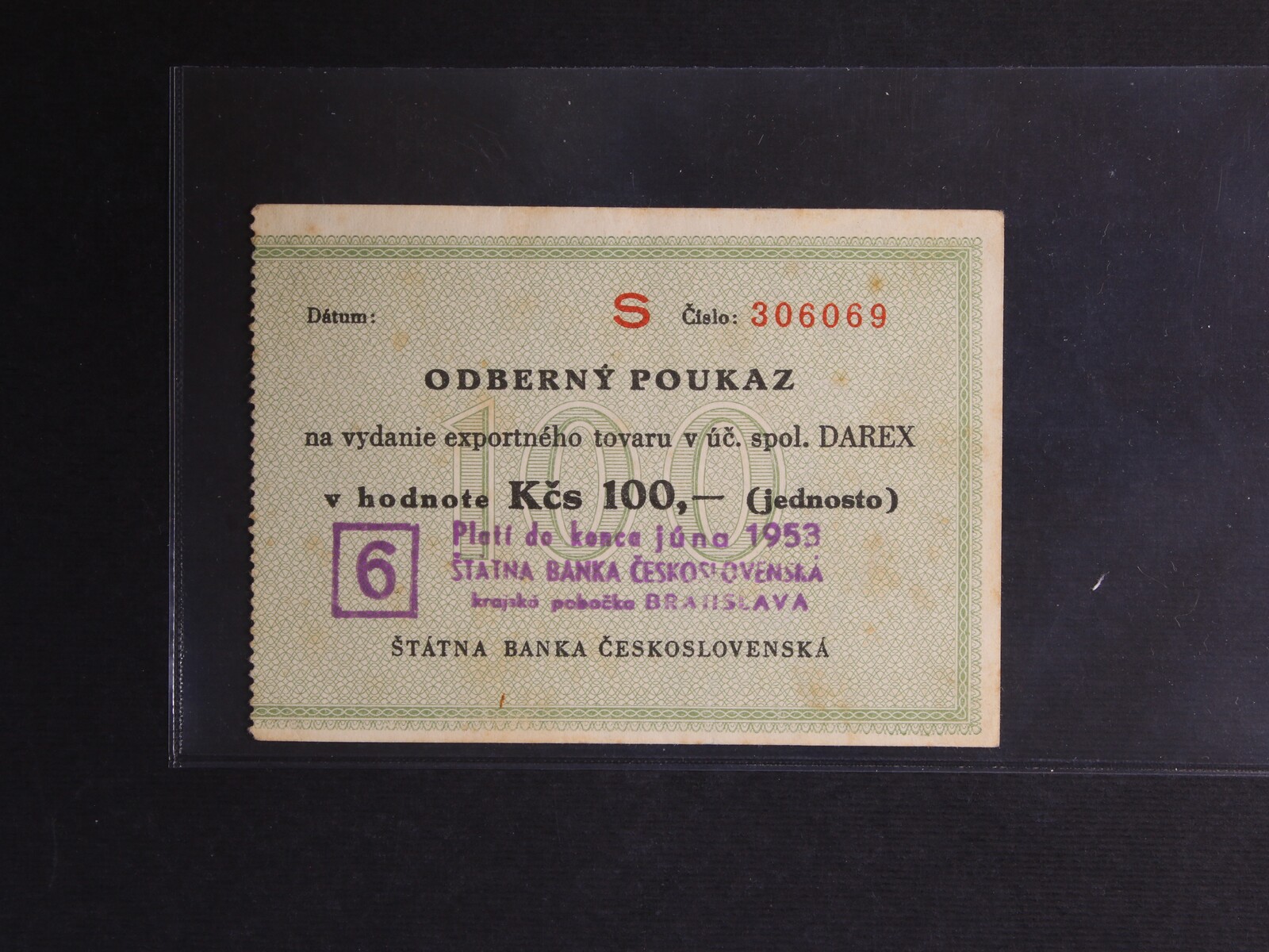Darex, odberný poukaz 100 Kčs s raz." Platí do konca júna 1953 ŠTÁTNA BANKA ČESKOSLOVENSKÁ KRAJSKÁ POBOČKA BRATISLAVA / 6", červený číslovač, série S, slovenský text se spodním řádkem "STÁTNA BANKA ČESKOSLOVENSKÁ", vodoznak "velké lipové listy v okraji", extrémně vzácný, skvrnky