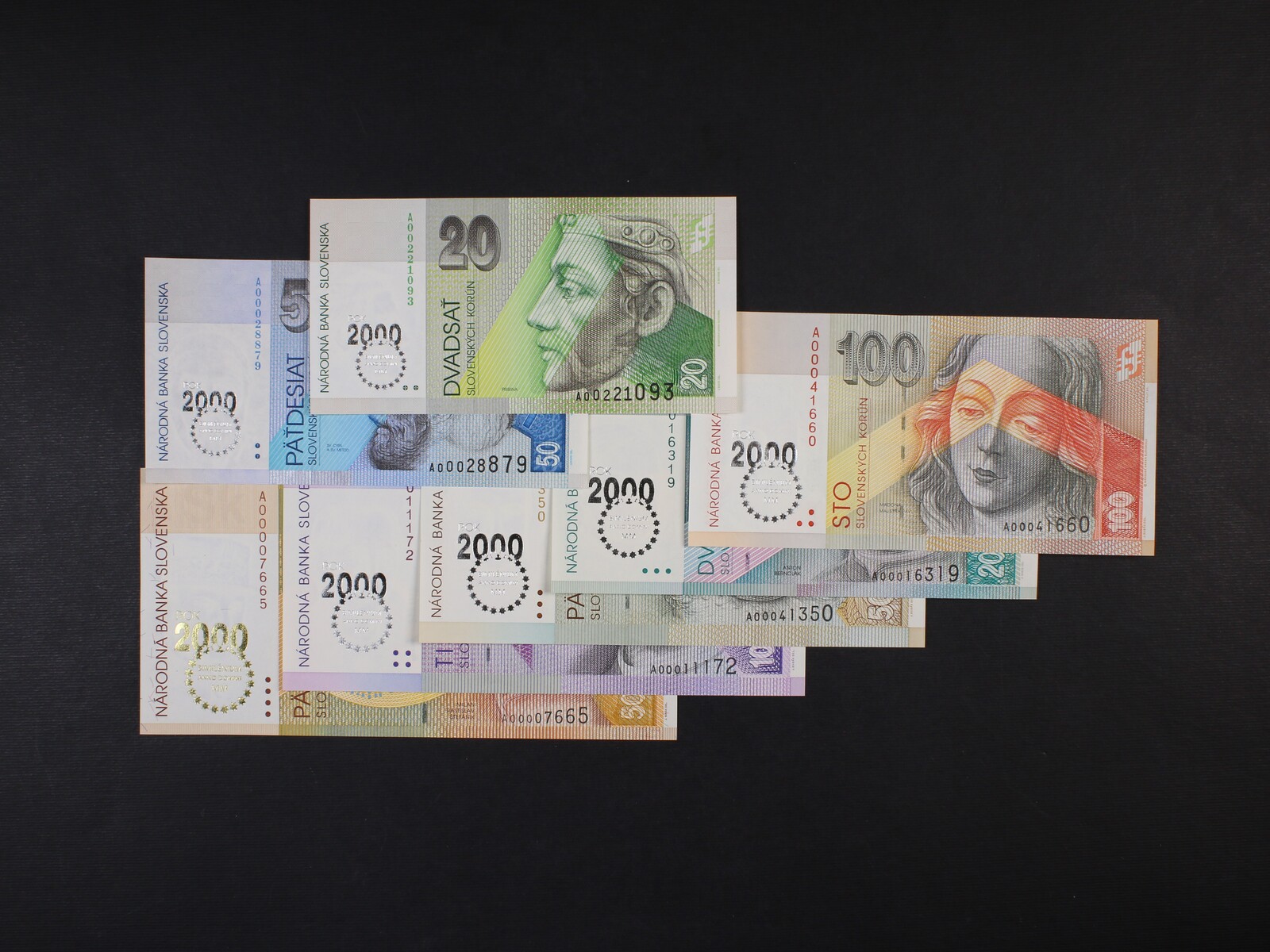 sada 20 Sk - 5000 Sk 1993 / 1995 série A s přítiskem BIMILÉNIUM, Ba. SK 6c, 7b, 8b, 9b, 10b, 11b,15b, Pi. 34 - 40, 7 kusů