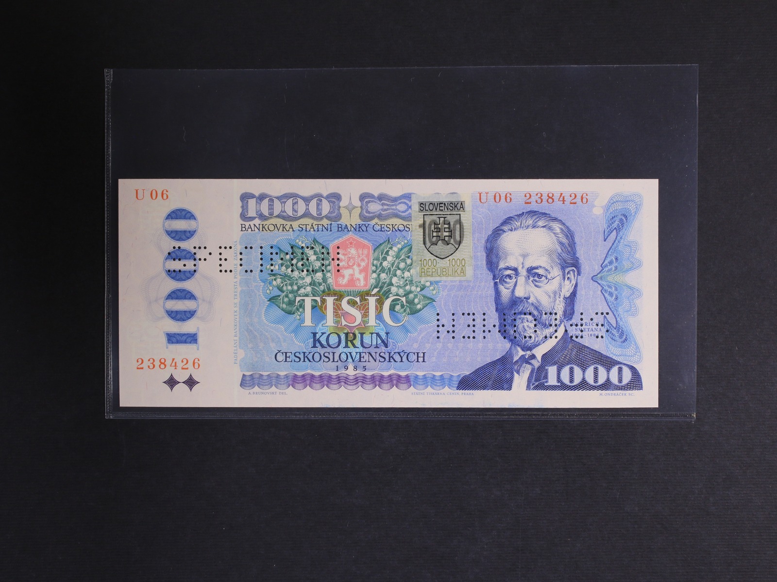 1000 Kčs/Sk 1985/93 série U 06 kolkovaná s 2x vodorovně zrcadlově perf. SPECIMEN, Ba. SK 5, Pi. 19s