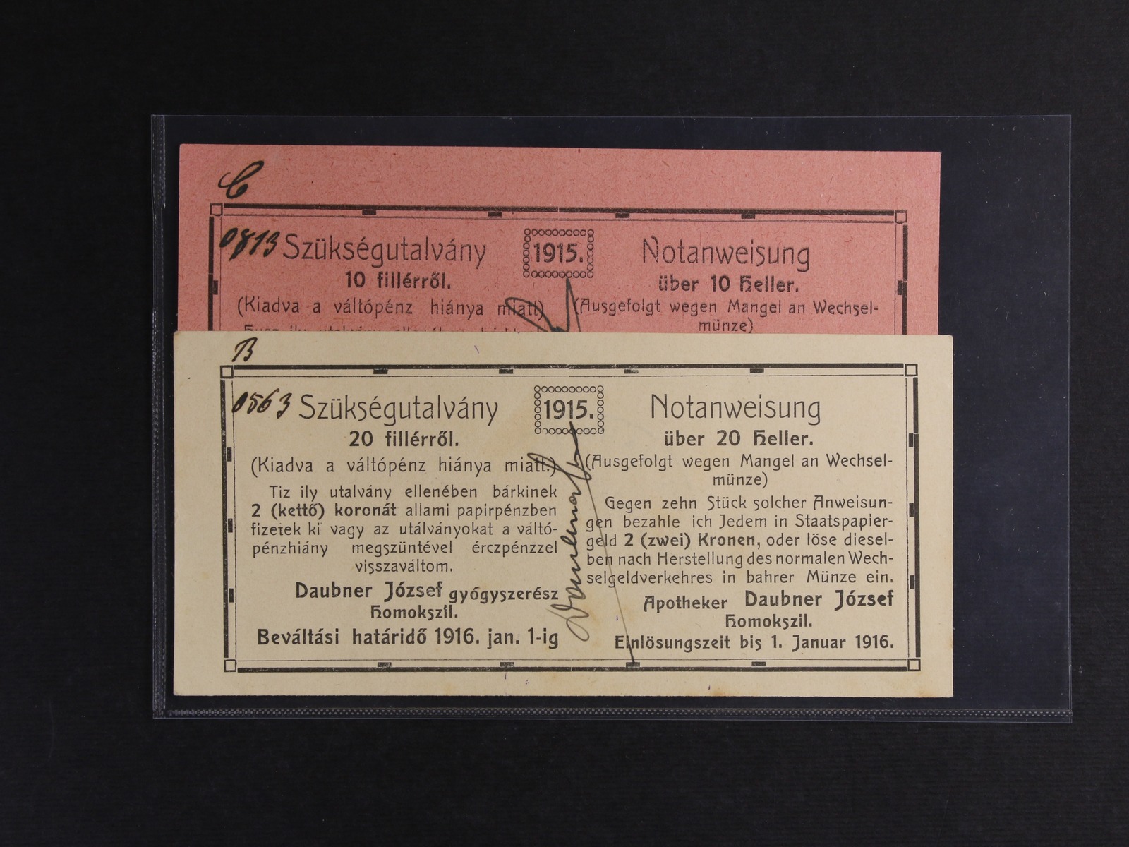 Homokszil (Uljma Srbsko), 10 a 20 heller 1.1.1916 Apotheker Daubner József, raz. podpisy, Adam HOM.1.1, 2