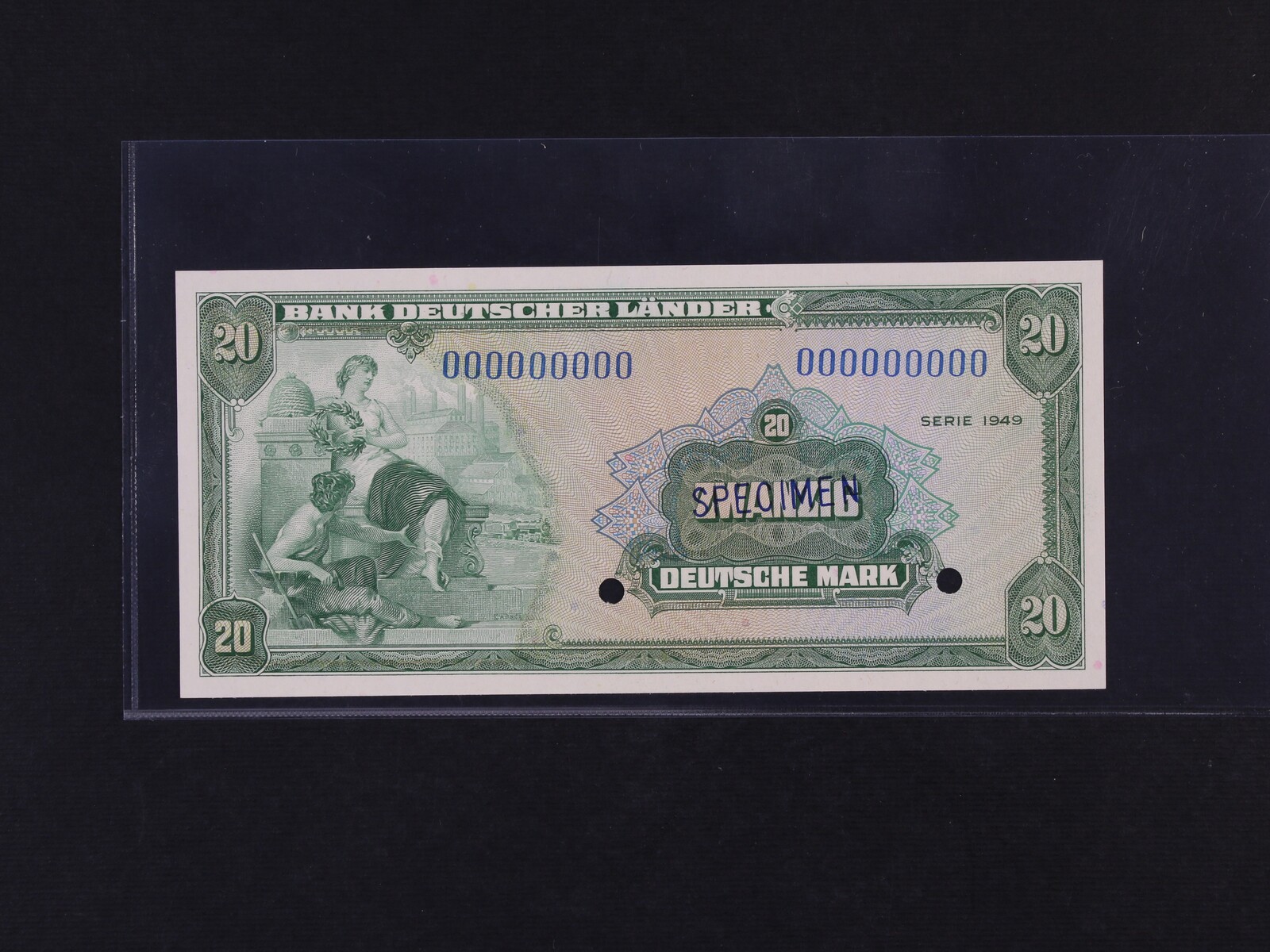 20 DM 22.8.1949 anulát s přetiskem SPECIMEN, 2x perf. otvor, Ro. 260M1, Pi. 17s, Grab. BRD-5M1