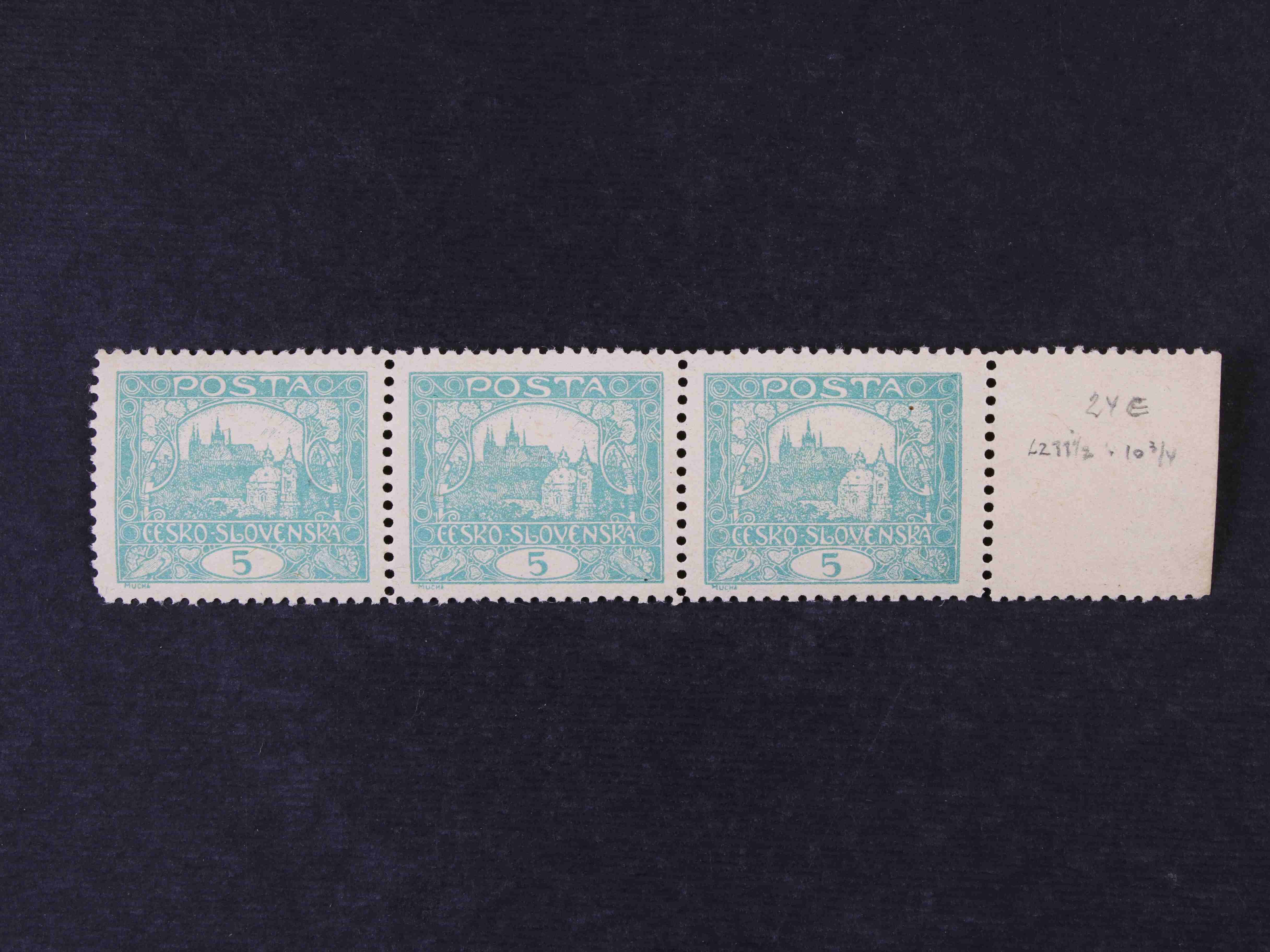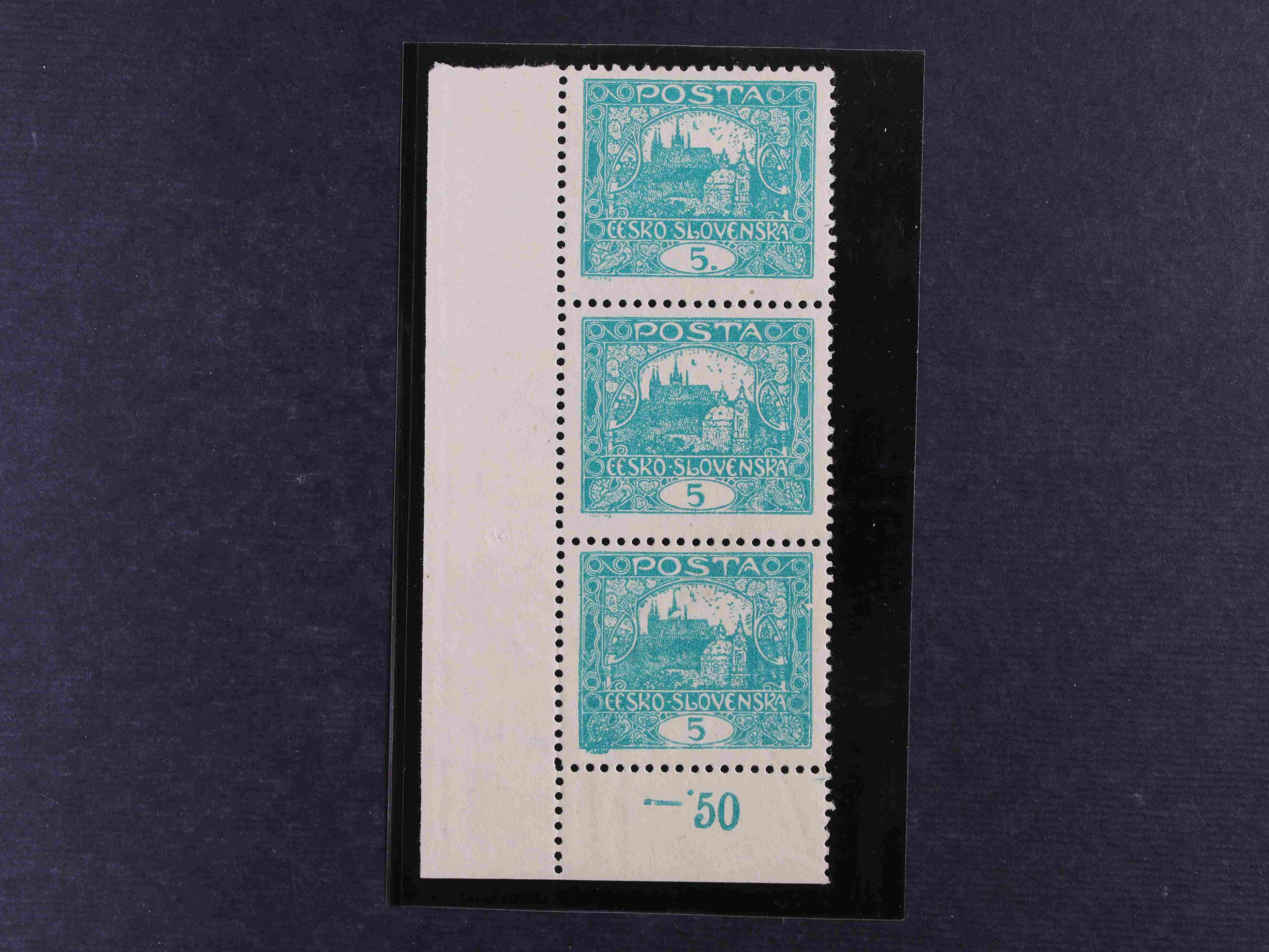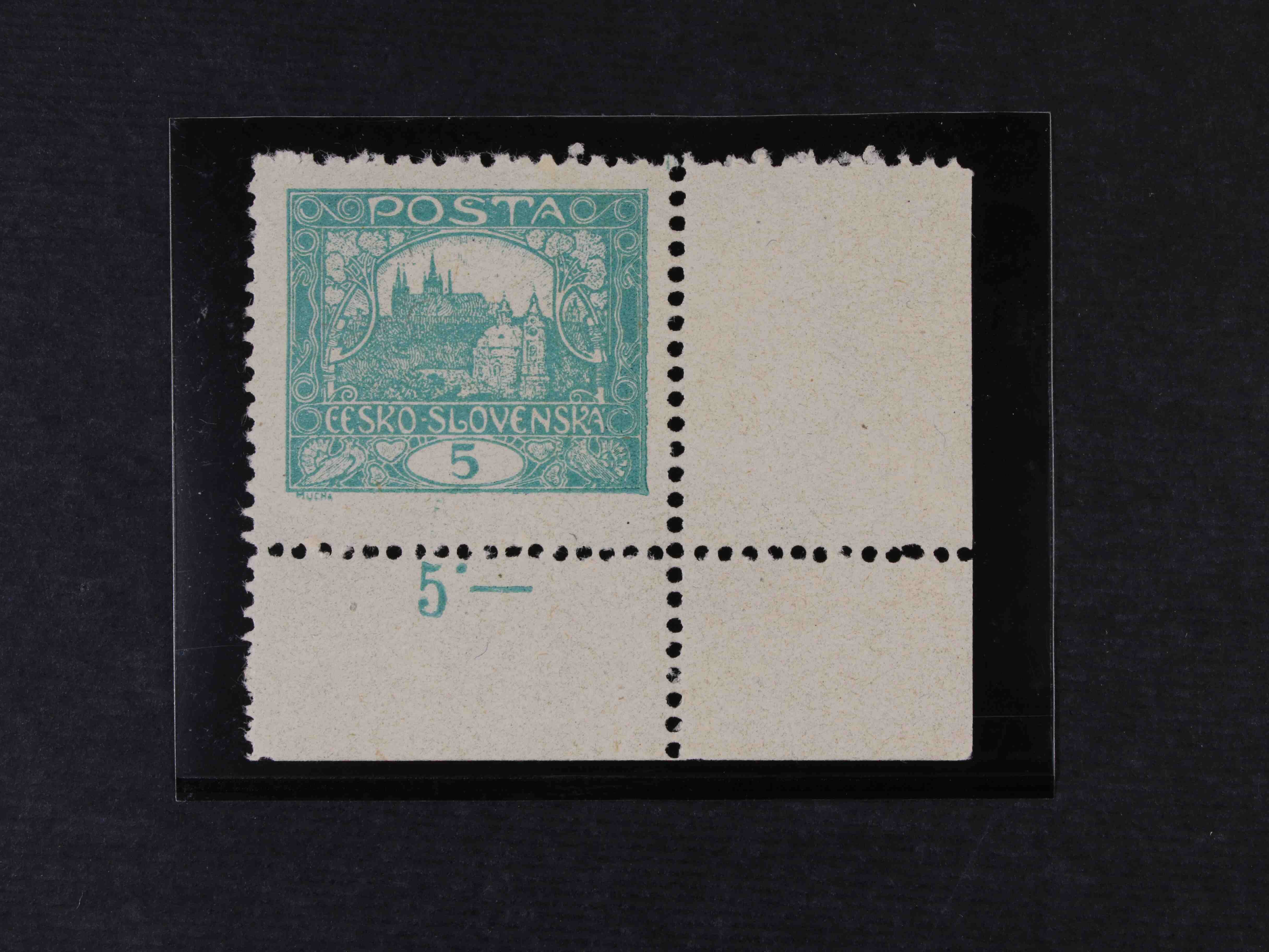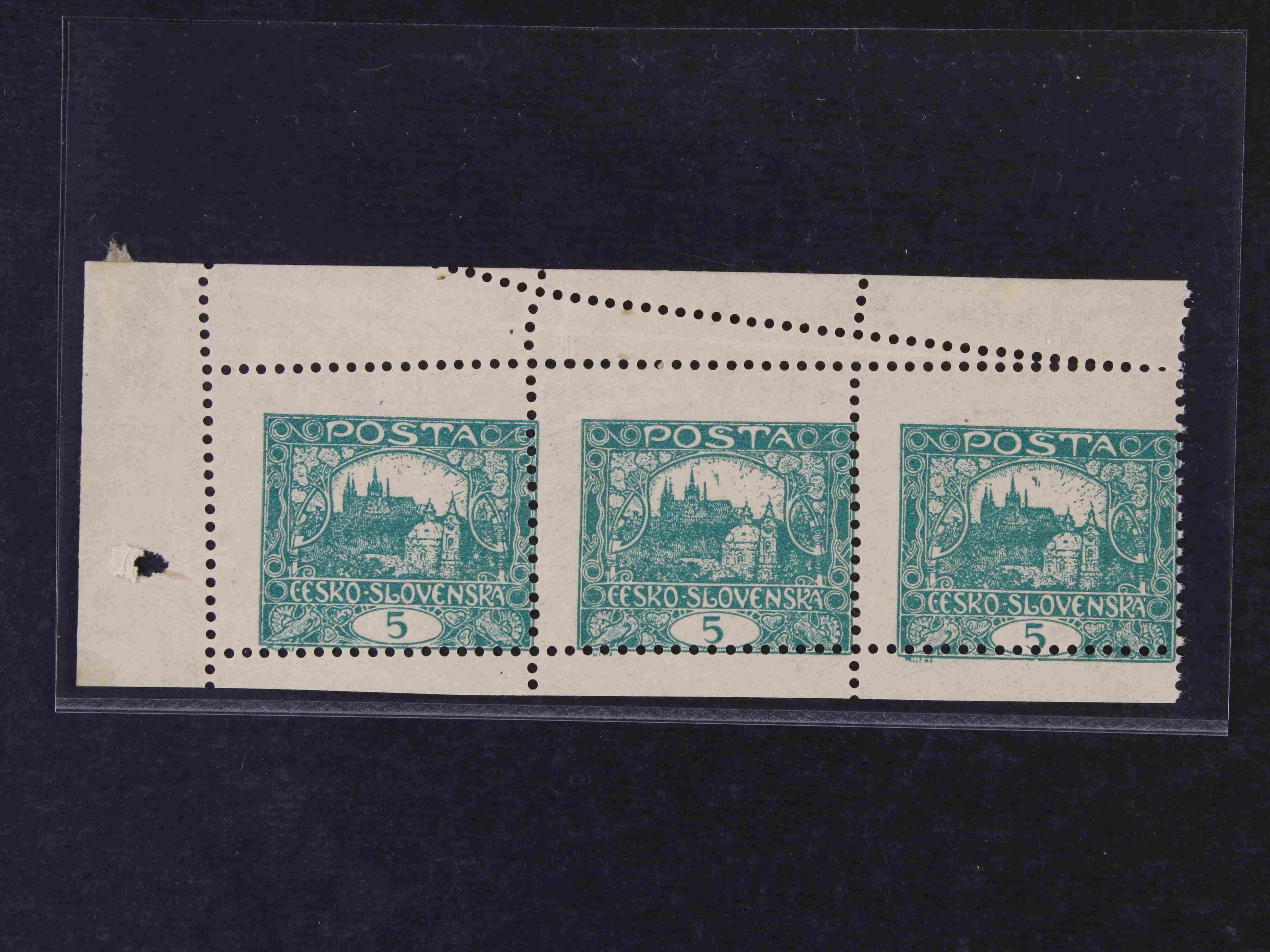 48 zn. č. 4 Ba 5h tmavě modrozelená - levá horní roh. třípáska s posunutou a dvojtou šikmou perforací na horním okraji 600