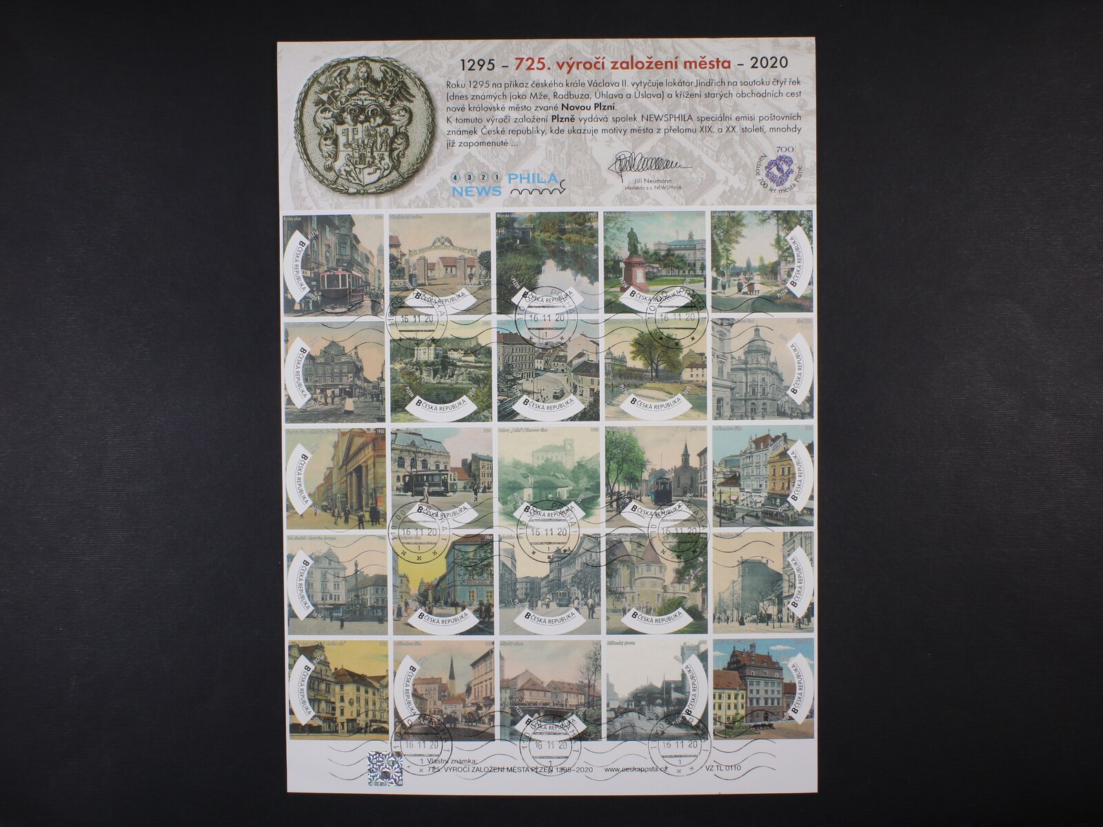 1337 Vlastní známka 725. VÝROČÍ MĚSTA PLZNĚ VZ TL 0110 s válečkovým raz. PRAHA 1 16.11.2020 1000
