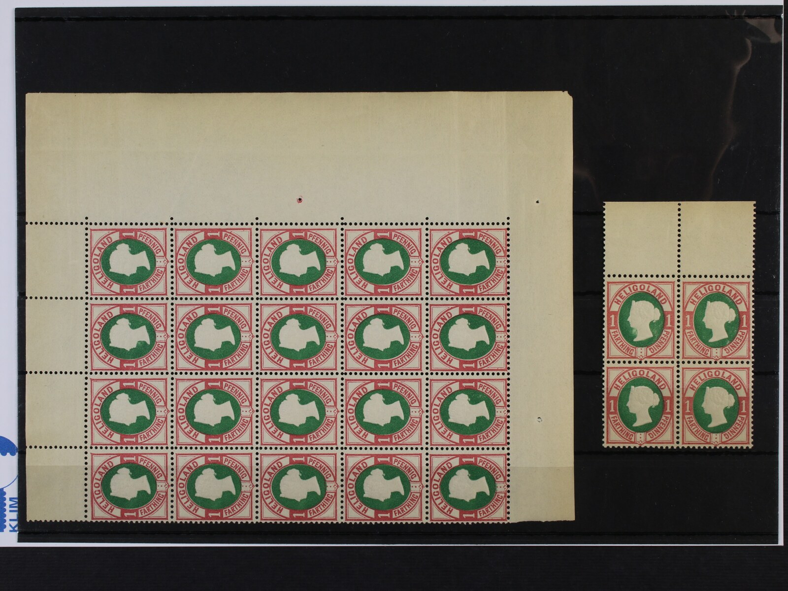 Helgoland - zn. Mi. č. 11 - pravý 20ti-blok s okraji + čtyřblok s horním okrajem s VV světlina pod bradou na horní levé známce