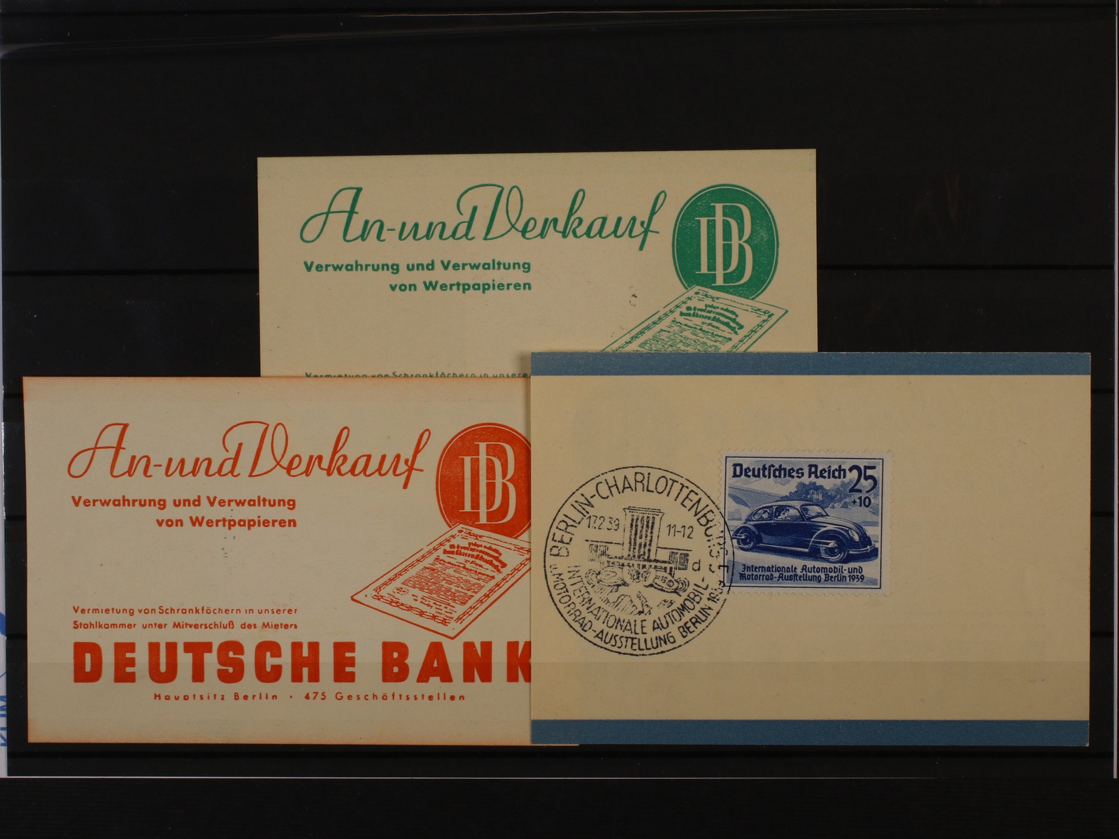 sestava 3 ks pam. listů DEUTSCHE BANK v barvě červené, zelené a modré s vylepenými zn. Mi. č. 686 - 8, pod. pam. raz. 1. dne BERLIN - CHARLOTTENBURG 17.2.39 ...