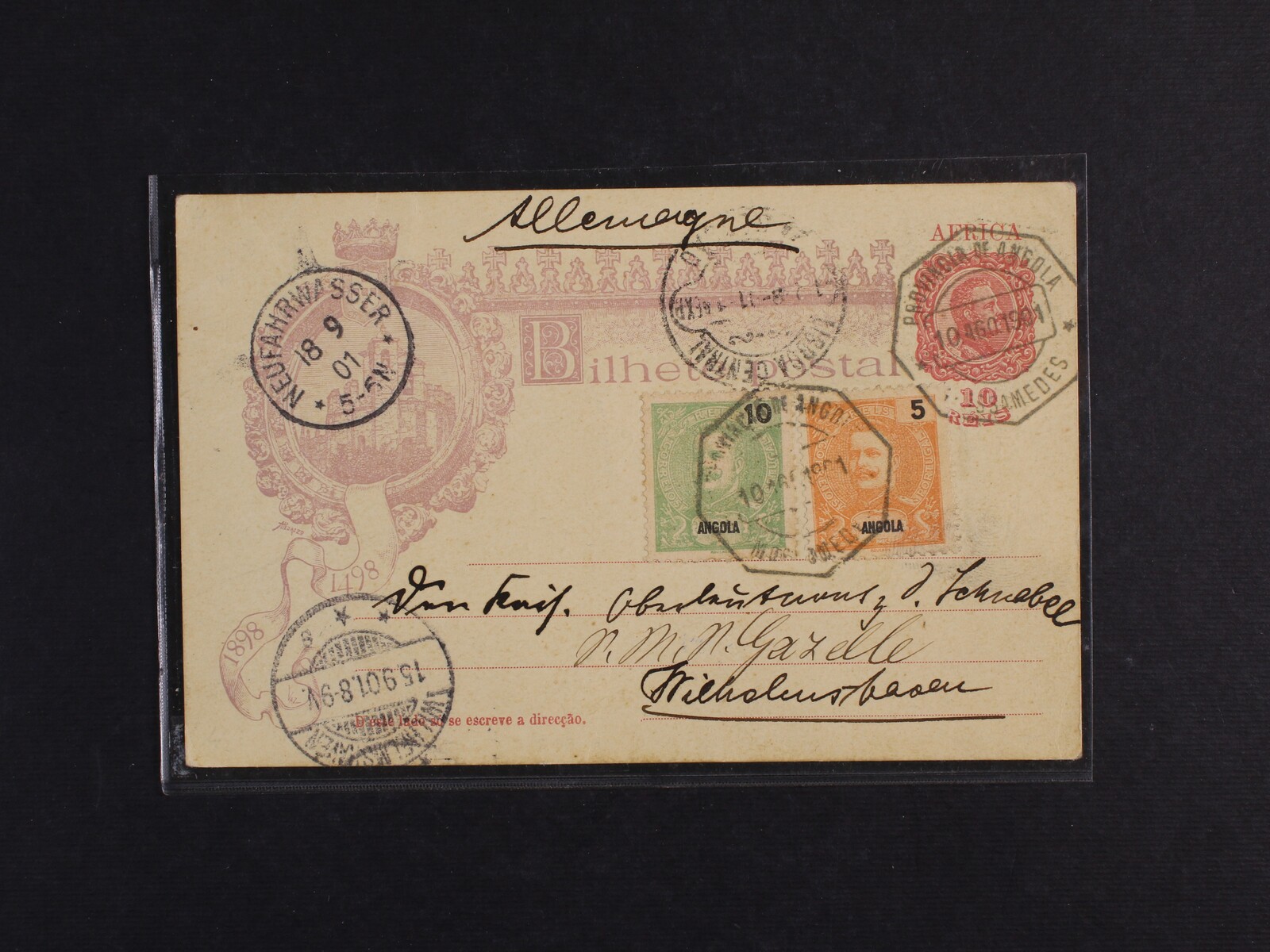 1627 Angola - let. celina 10reis dofrank. zn. 5 a 10reis do Německa, pod. raz. PROVINCIA DE ANGOLA 10.AGO.1901, průch. a přích. raz., dekorativní, zajímavé 800
