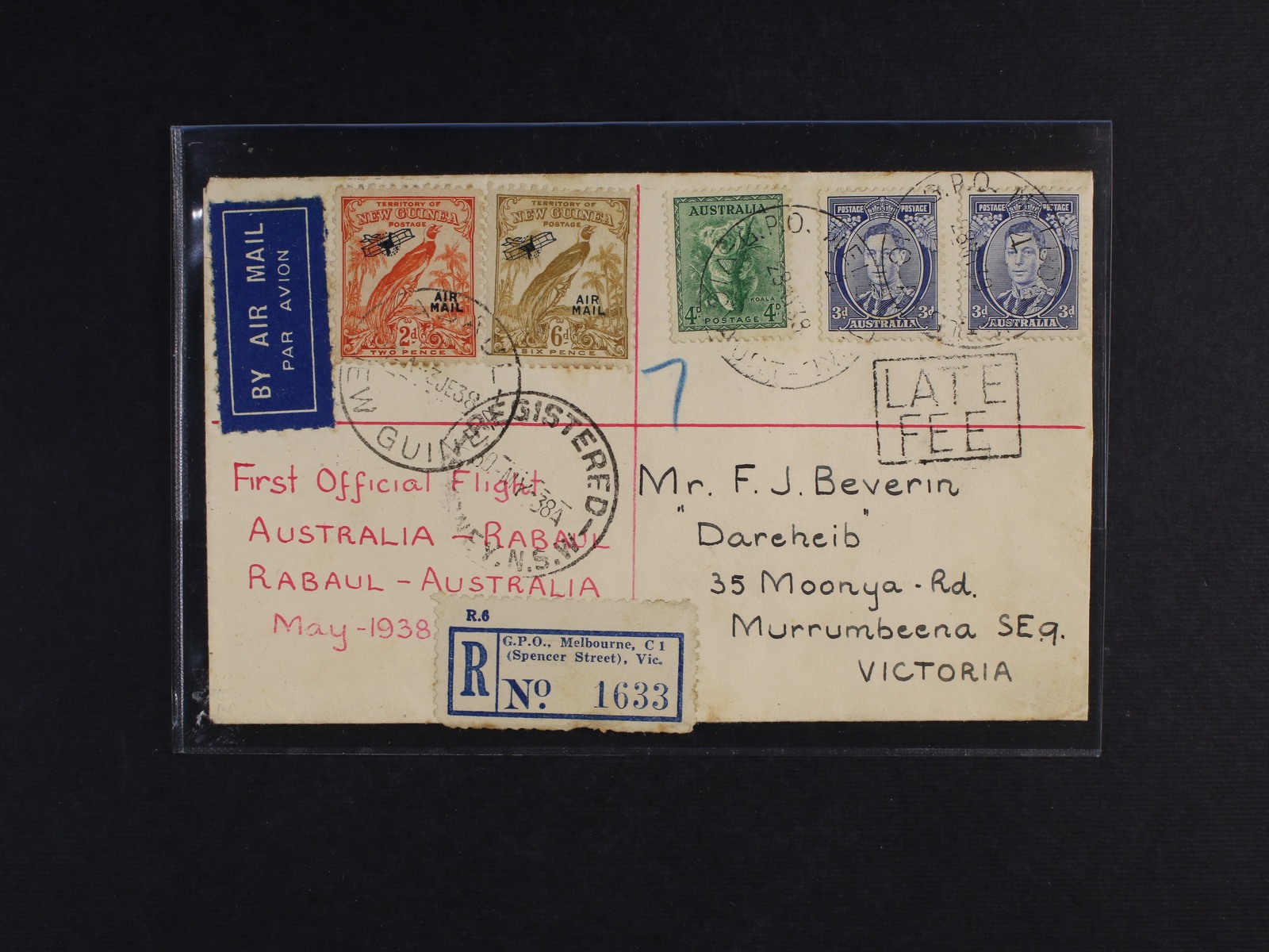 1628 Austrálie - let. R-dopis přepr. 1. letem Australia - Rabaul, Rabaul - Australia 1938, frank. smíš. frankaturou zn. Austrálie a Nové Guinee, pod. raz. REGISTERED MELBOURNE 30.MY.38, průch. raz. RABAUL, SYDNEY, přích. raz. MELBOURNE, zajímavé, dekorativní 600