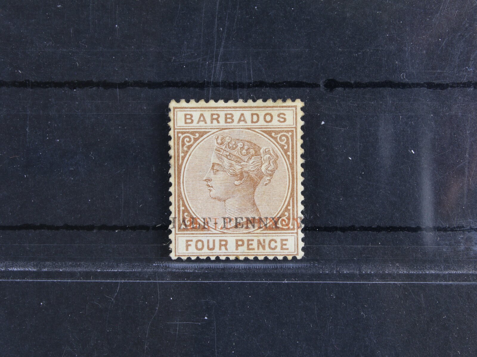 1629 Barbados 1902 - zn. SG. č.104b, Viktorie 4P (De La Rue) s přetiskem HALF PENNY, přetisk ČERNÝ + ČERVENÝ; patina, zk. Scheller, kat. 900 GBP, významné provizorium z krátkého období nedostatku malých nominálů, platnost pouze 2 týdny 9000