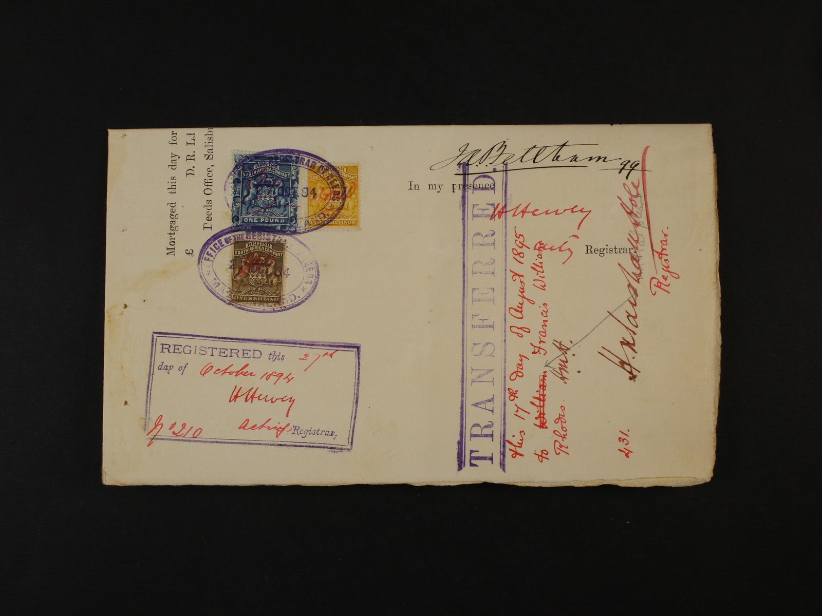 1634 Britská Jižní Afrika - převodní listina z r. 1895 frank. zn. Mi. č. 3, 6, 8, znehodnoc. fialovým fiskálním raz. 1000