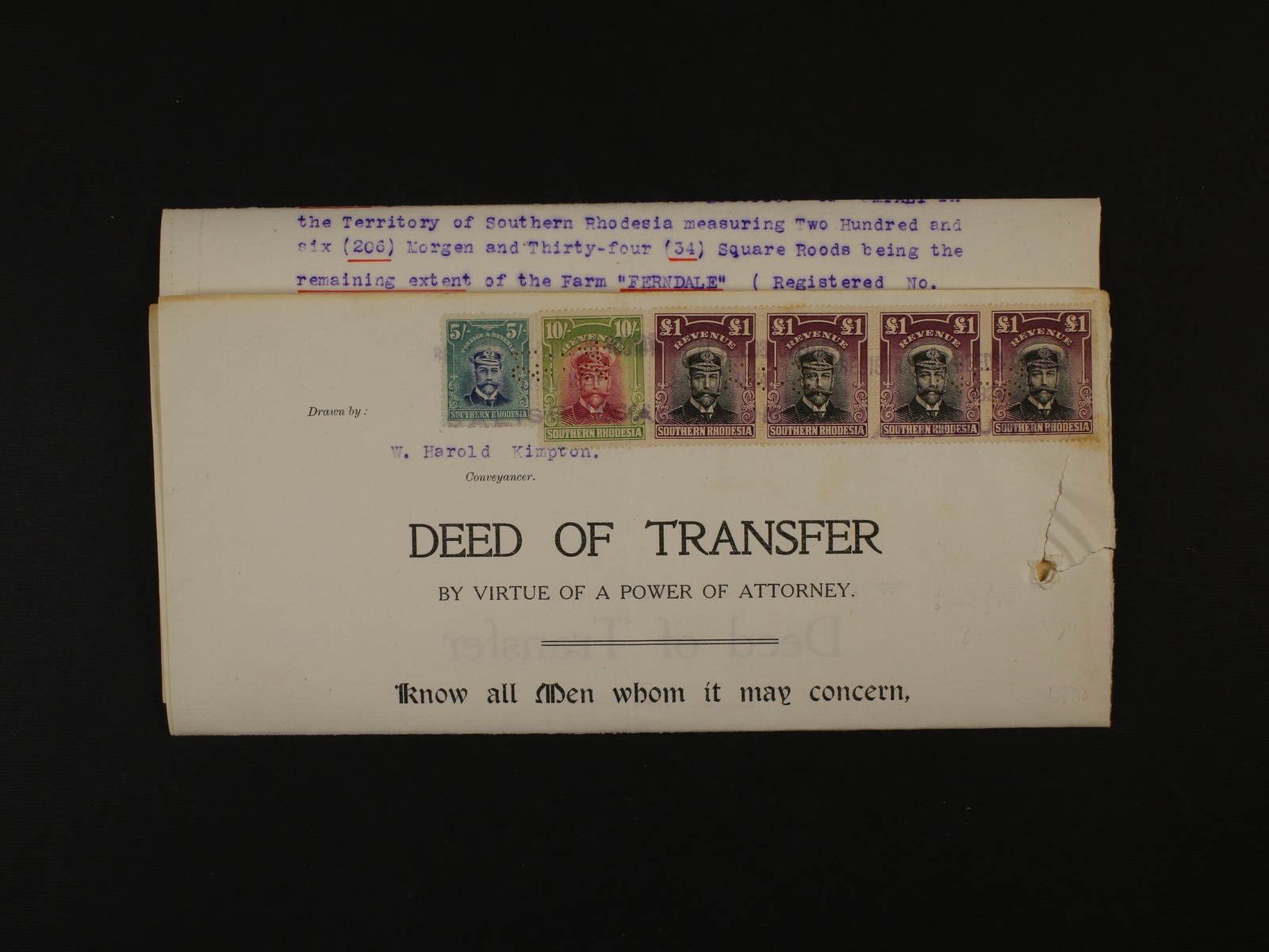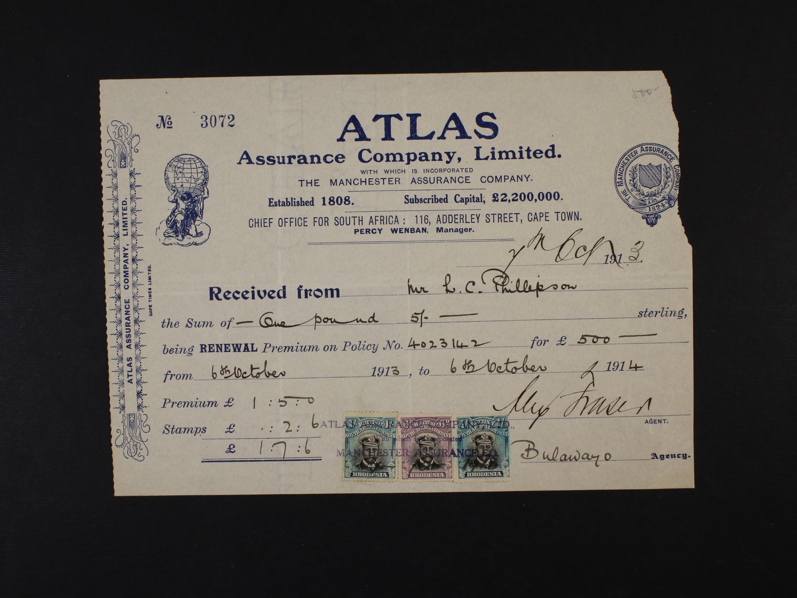 1637 Britská Jižní Afrika - Rhodesie - pojišťovací smlouva z r. 1914 s vylepenými zn. Mi. č. 127 II, 130 II (2x), znehodnoc. řádkovým fiskálním raz. 500