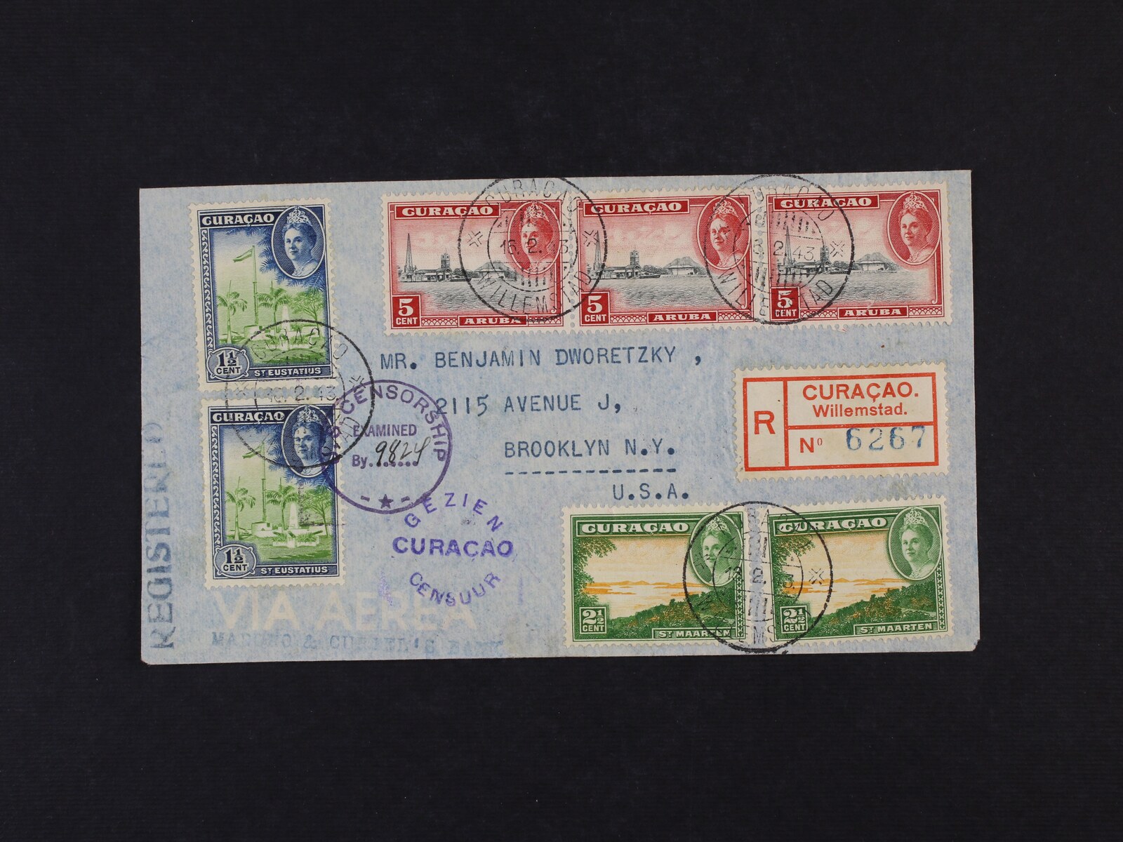 1638 Curacao - R-dopis do USA frank. pestrou násobnou frankaturou, pod. raz. CURACAO WILLEMSTAD 16.2.43 + průch. přích. a cenzurní raz. 500