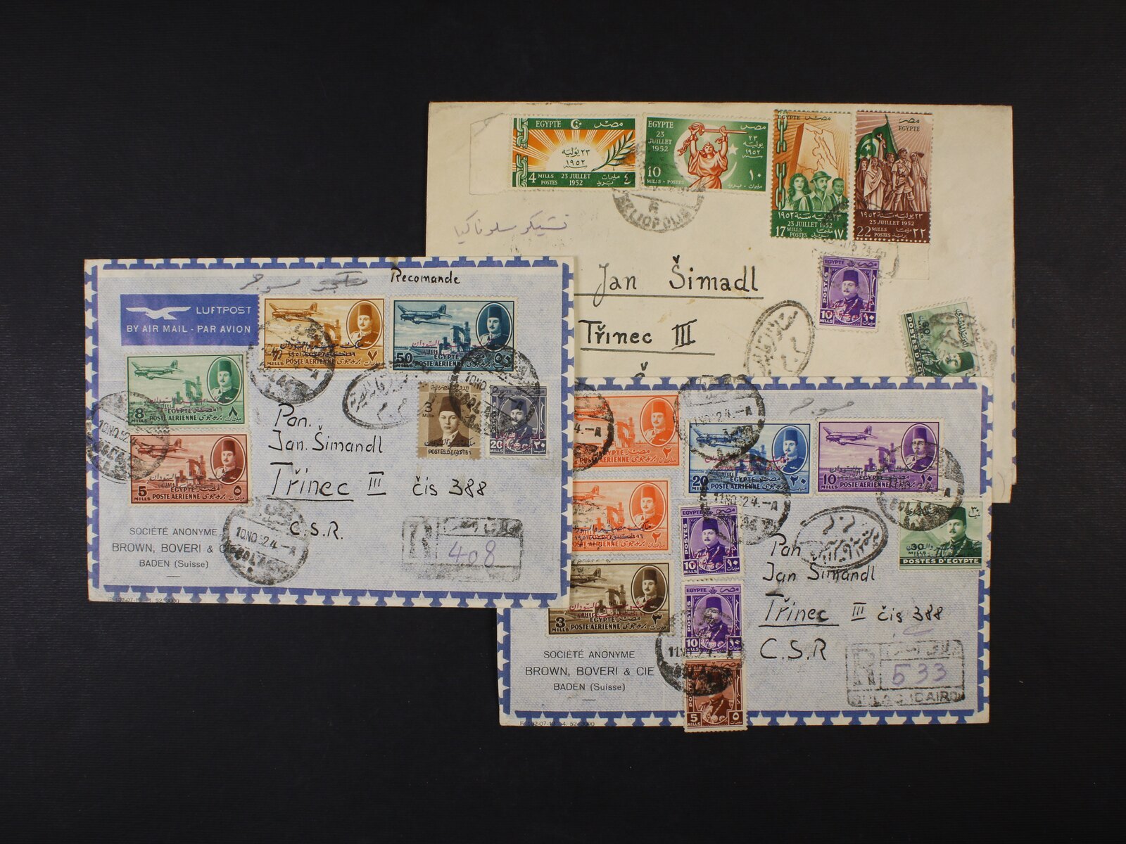 1640 Egypt - sestava 7 ks let. firemních dopisů z Egypta do ČSR z r. 1952 (z toho 4x RECO), pestré zajímavé vysoké frankatury 500