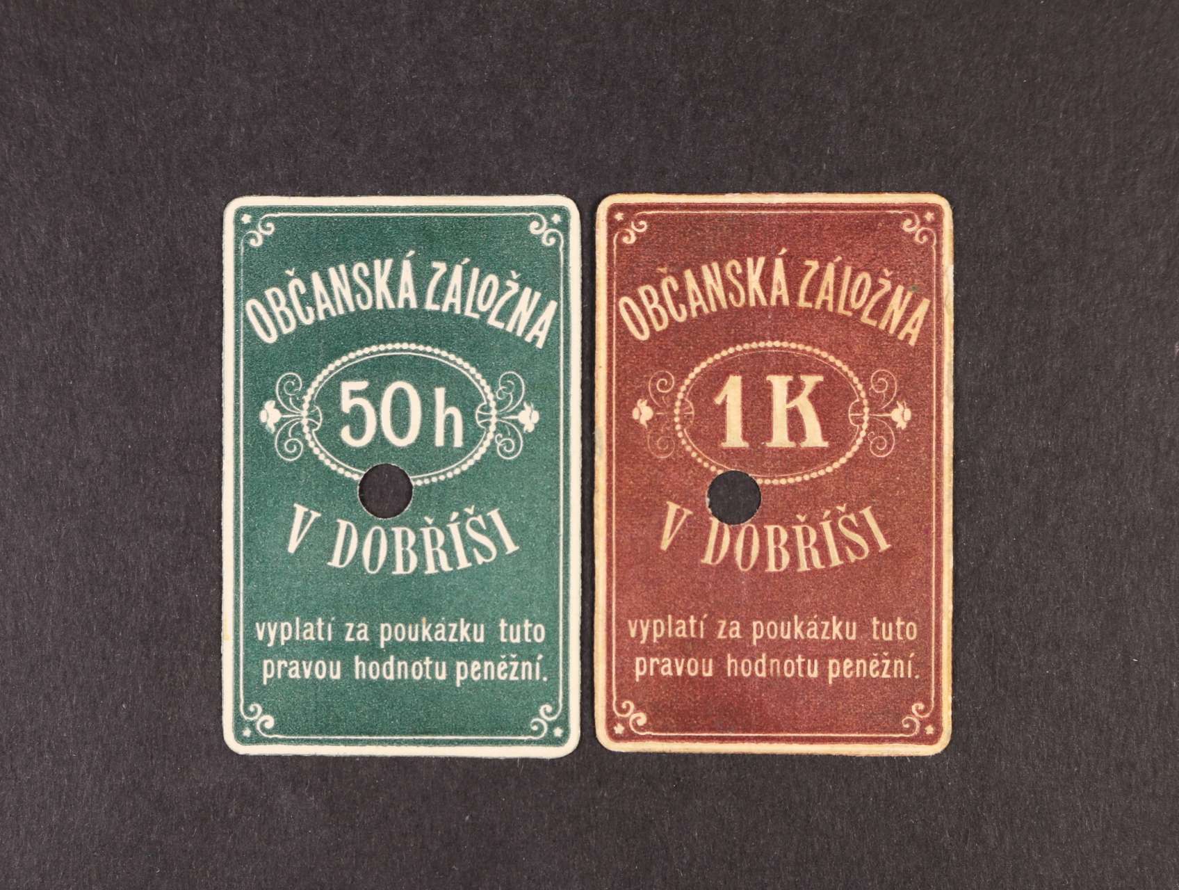 Dobříš, 50 h, 1 K b.d. Občanská záložna, obě s perf. otvorem, D.H. 36.2.1a, 2a