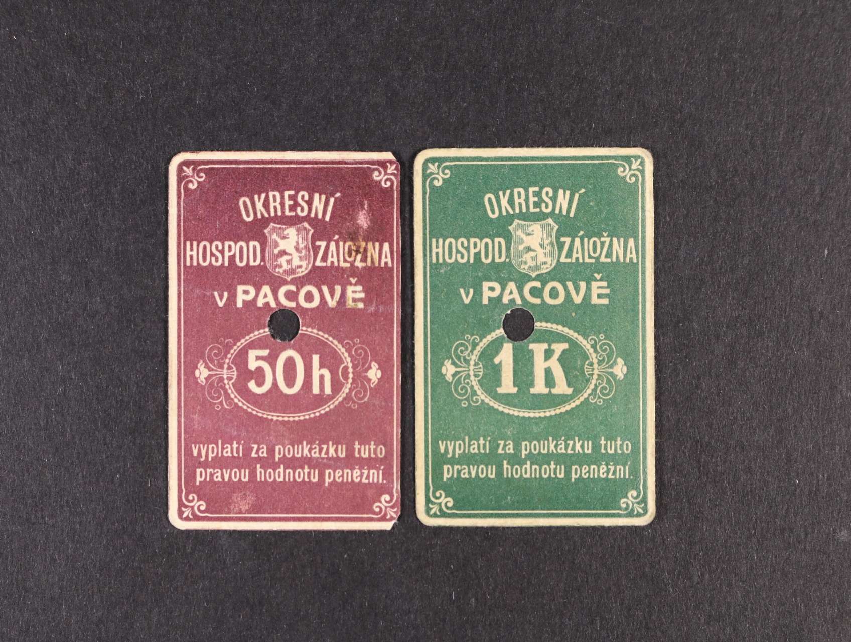 Pacov, 50 h, 1 K b.d. Okresní záložna, obě s perf. otvorem, D.H. 156.2.1a, 2a