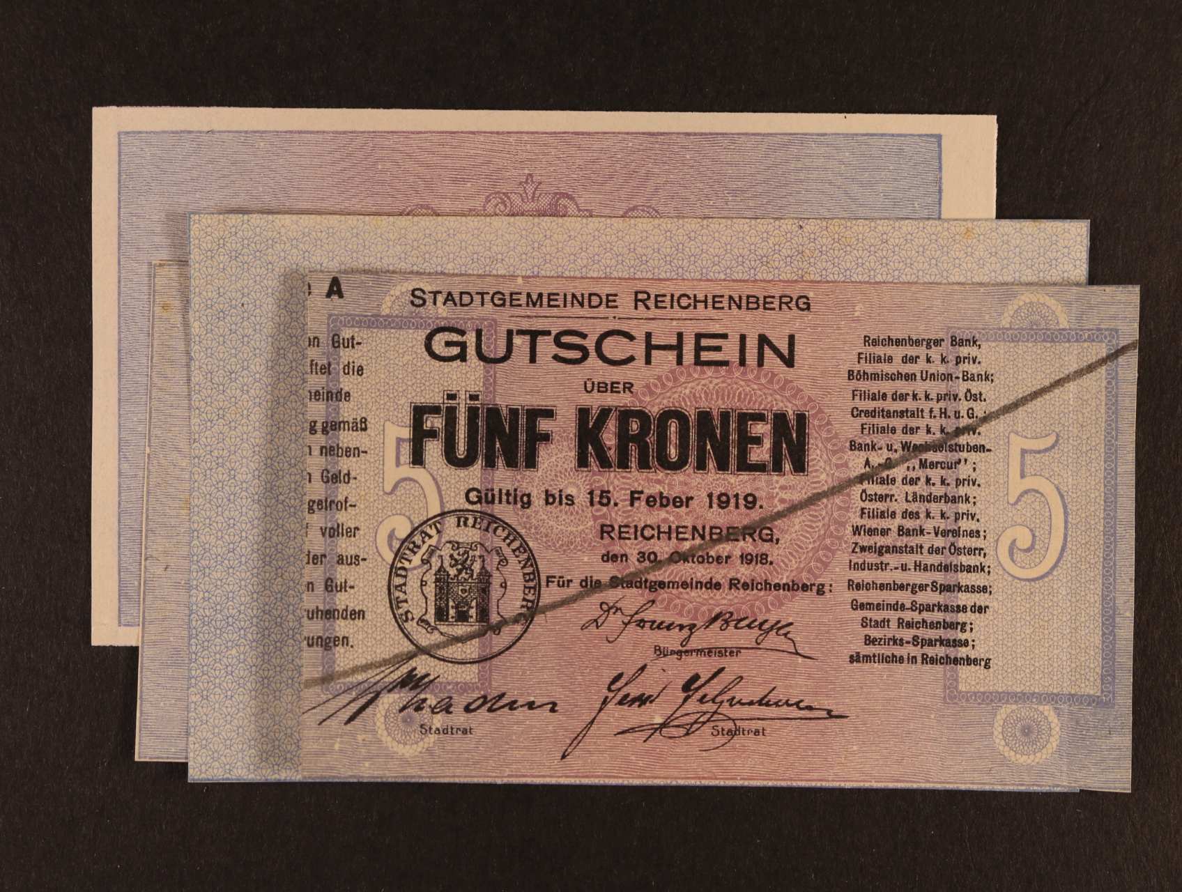 Reichenberg (Liberec), 4 ks makulaturních jednostranných tisků - podtisky 5 a 10 K, 1x posun tisku, D.H. 173.6.1, 2