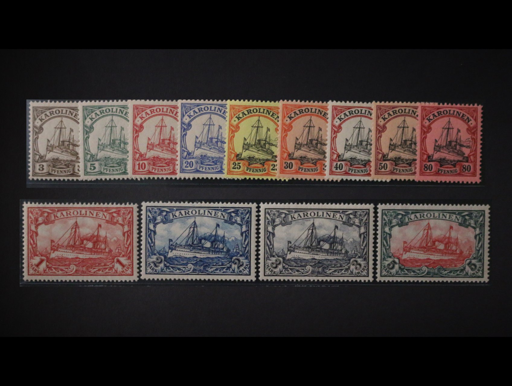Karolinen 1900-1915, zn. Mi. č. 7-18, 22; „Lodě“ 3Pfg-5M