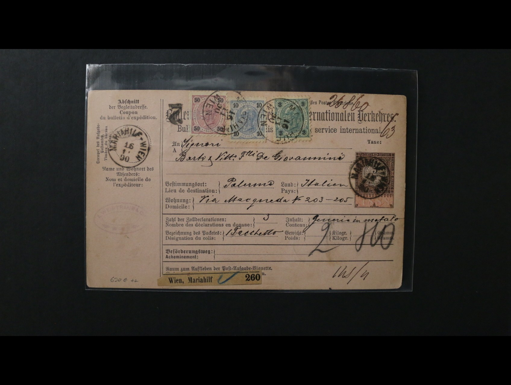 1121 balíková průvodka do Palerma raz. MARIAHILF WIEN, frank. 3+10+50kr (kulatá čísla, „padesátka“ je vzácná hodnota na jakékoli celistvosti), kat. min. 630 EUR 1500