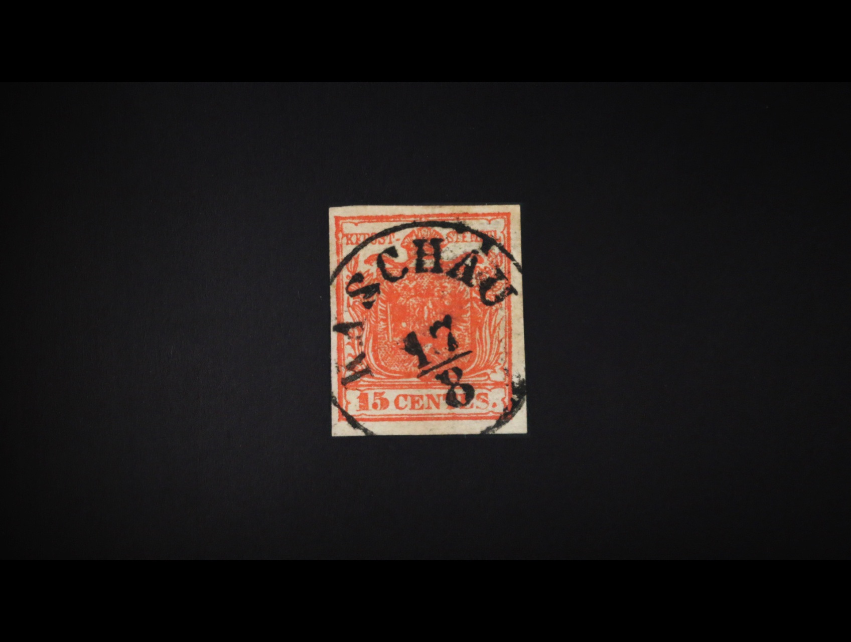 1131 zn. Fe. č. 3, 15CTS I. typ, geripptes Papier, s raz. KASCHAU, použití známky pro Lombardsko – Benátsko na Slovensku je mimořádné!, kat. 400 EUR 2000