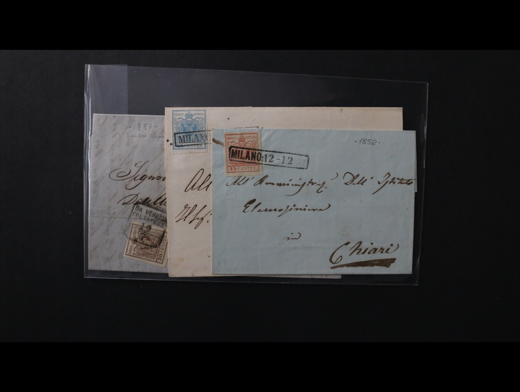 1134 skl. dopis z r. 1858 frank. zn. Fe. č. 2, 3 x 10CTS, strojový papír III. Typ, MILANO, zaslán do Brescie, úzké ale pravidelné střihy – Liliputschintt; násobné frankatury 10Cts na MP se téměř nevyskytují, kat. Ferchenbauer 4000 EUR, kat. Sassone 8000 EUR 22000
