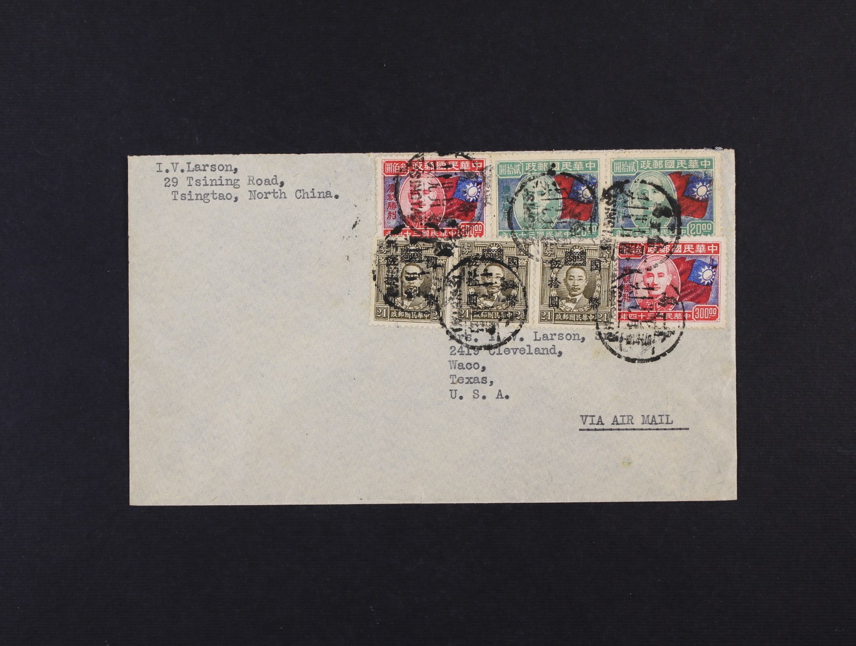Čína - dopis do USA frank. zn. Mi. č. 656 (2x), 659 /(2x), 707 (3x), pod. raz. TSINGTAO, zajímavé