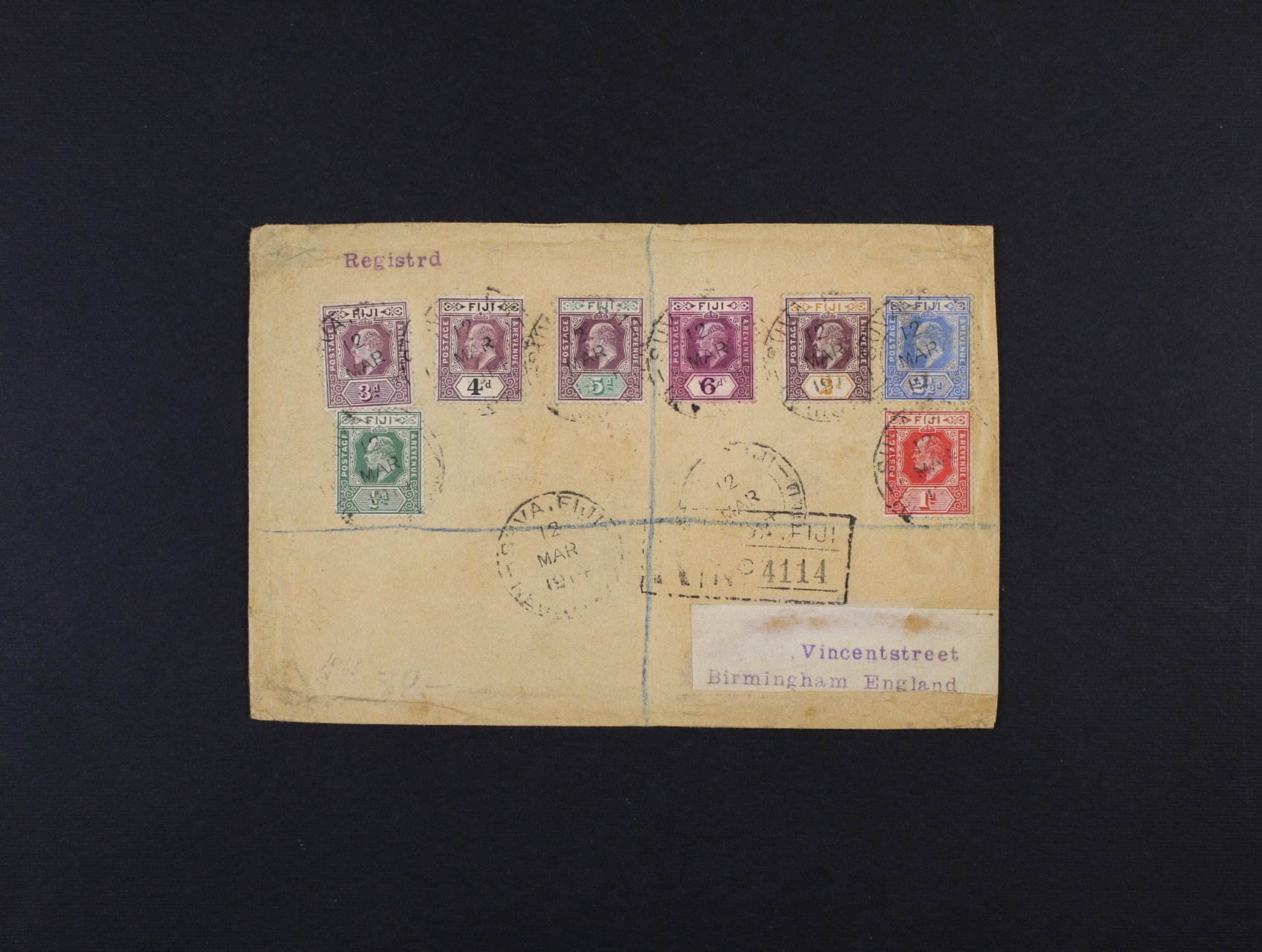 Fiji - let. R-dopis do Anglie frank. pestrou frankaturou, pod. raz. FIJI ...12.MAR.1914 + průch. a přích. raz.