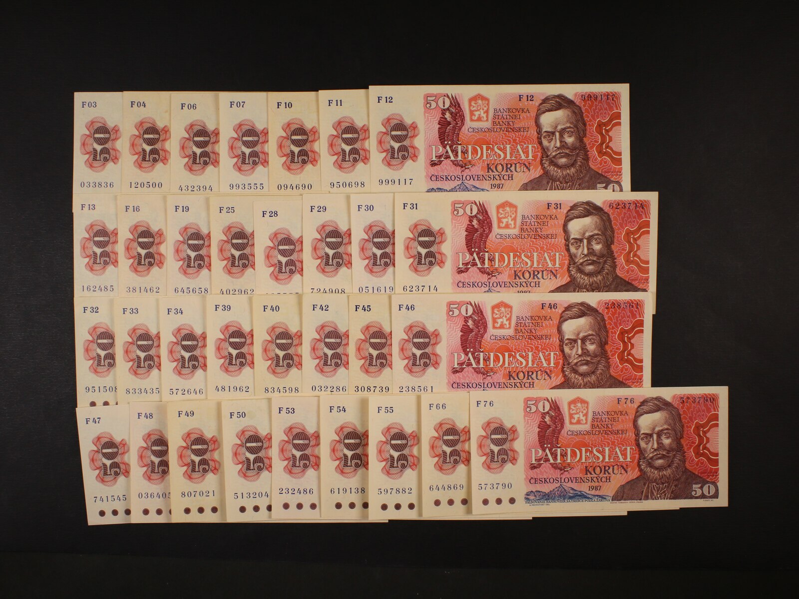 50 Kčs 1987 série F 03, 04, 06, 07, 10, 11, 12, 13, 16, 19, 25, 28, 29, 30, 31, 32, 33, 34, 39, 40, 42, 45, 46, 47, 48, 49, 50, 53, 54, 55, 66, 76, Ba. 104a, Pi. 96a, 32 kusů